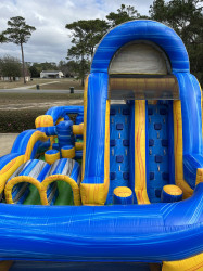 Jump into fun with our obstacle course! Race your way through the twists and turns. This adventure offers a 16' slide that lands in a splash pad (about 6 inches). This unit is sure to please a crowd!