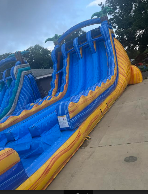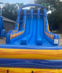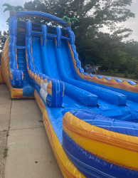 Take your party to the next level!! Drop 22' and slide into fun!! This slide features 3 sliding lanes to entertain a crowd! The stairs on the outside lane offer a safe and fast way to climb up quick. It has extended dual lanes for exciting races with a deep pool (about 12 inches) to splash into! This waterslide will bring the fun for kids and adults of all ages. Step up your party with this crowd pleaser!
