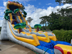 Get ready for a Jurassic adventure!! This 28' Jurassic Falls Slide is a dual lane racer with a quick drop to send a rush of adrenaline. It has a single lane with a quick drop into a deep pool (about 12 inches) to splash in. Give your family and friends something to roar about, reserve this slide today!